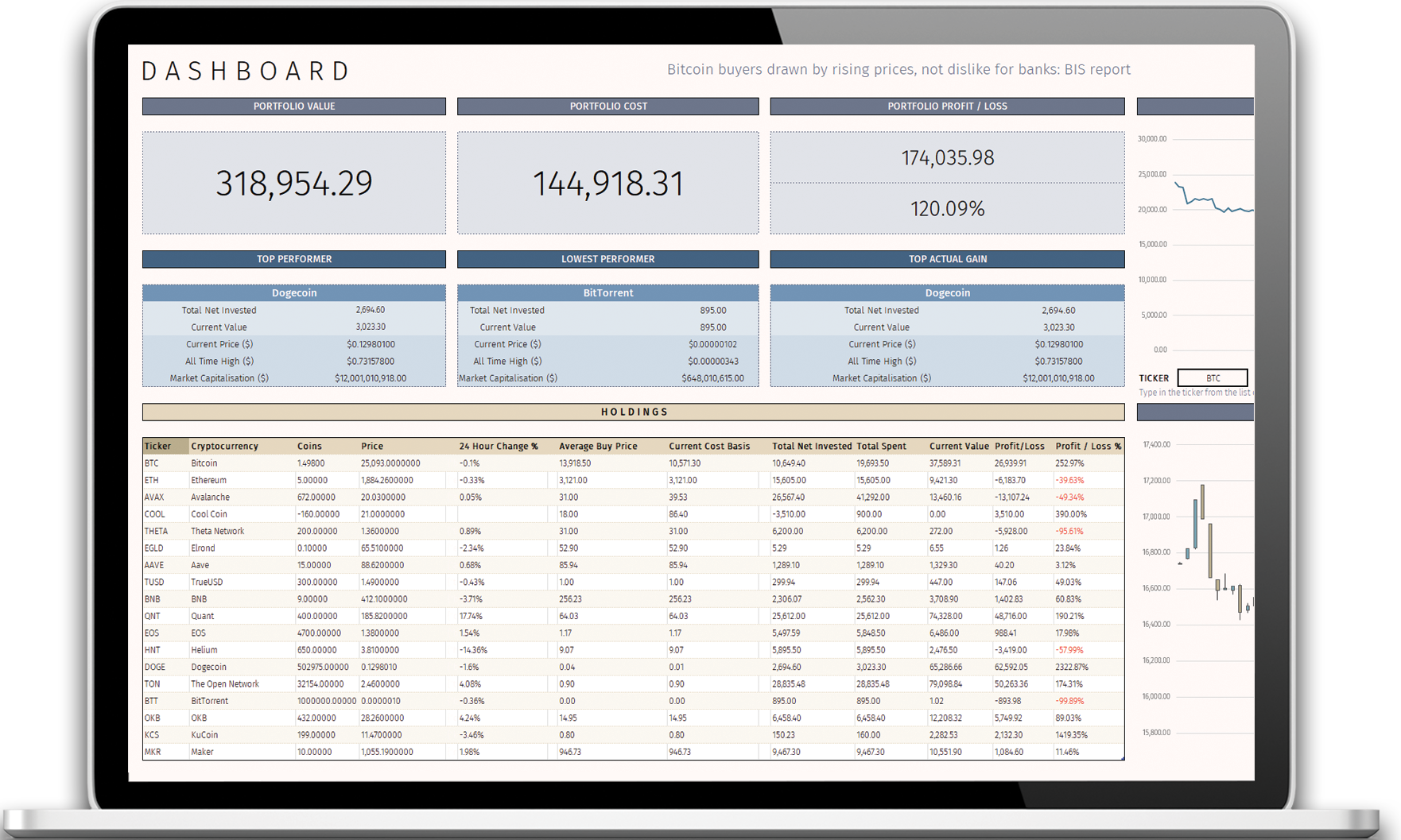 Stay on top of your Cryptocurrecy investments with the Cryptocurrency Portfolio Manager v3.3. Using this template you can track your entire portfolio with price information pulled directly into Excel/Sheets allowing you to stay up-to-date on the ever-chaging Crypto market.